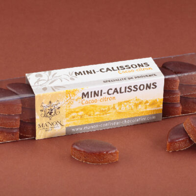 Ces Mini-Calissons au Cacao et au Citron, tout comme les calissons traditionnels, sont à base d’amandes, de melon confit et recouvert de glace royale cacaoté. Surprenez vos amis avec les Minis, ils sont de taille idéale pour une pause café originale. La boite transparente de 125 g comprend 24 Mini- Calissons (tout cacao /citron). A savourer aussi au Duo calissons / Calinoises … Ingrédients : Amandes ; Sucre glace ; Écorces de citron 15% confites (correcteur d’acidité : acide citrique) ; Sucre ; Melon confit ; Sirop de sucre inverti ; Sirop de glucose ; Pâte de cacao 3% ; Blanc d’oeuf ; Écorces d'orange confites ( dont correcteur d'acidité : acide citrique) ; Pain azyme ( Fécule de pomme de terre, eau) ; cacao en poudre 0.5%, extrait de Grand-Marnier. Fabrication Artisanale. Garantie sans conservateur, ni colorant. Arômes naturels. Prix au kilo 57.60€ -