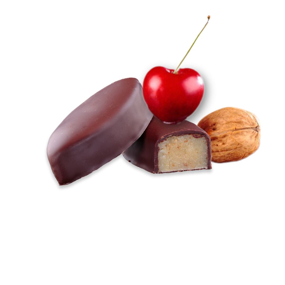 Ingrédients : Chocolat noir 72 % de cacao (pâte de cacao, sucre de canne roux, beurre de cacao, émulsifiant : lécithine de SOJA (garantie SANS OGM), vanille naturelle), AMANDES, Sucre, NOIX, Sucre glace, Sirop de sucre inverti, Sirop de glucose, Pain azyme (fécule de pomme de terre, eau), Kirsch.