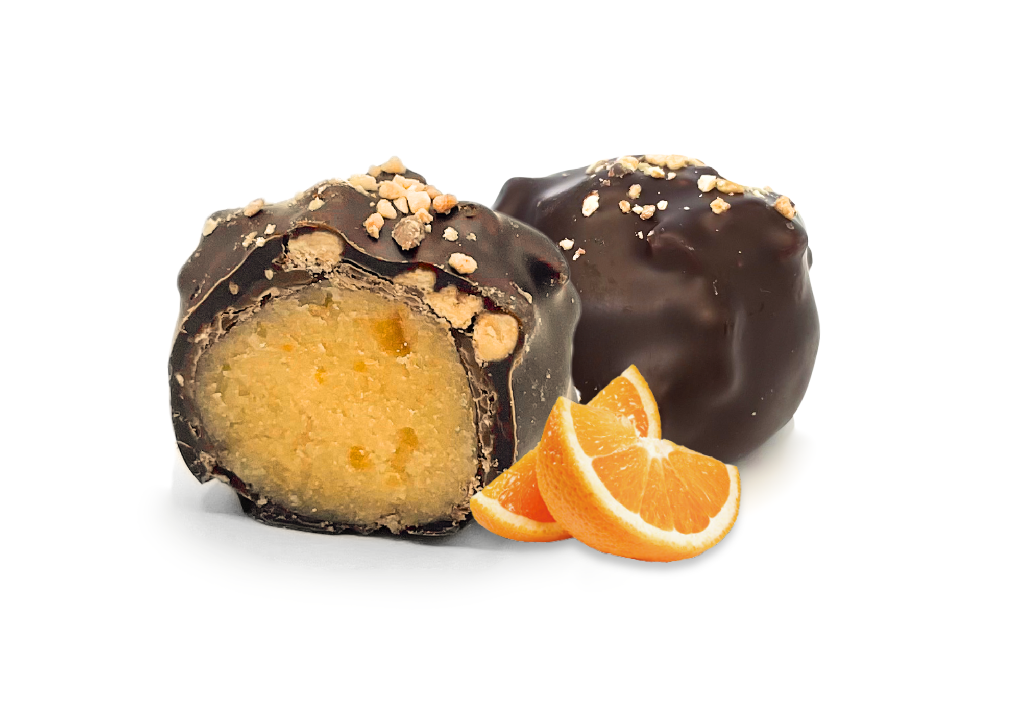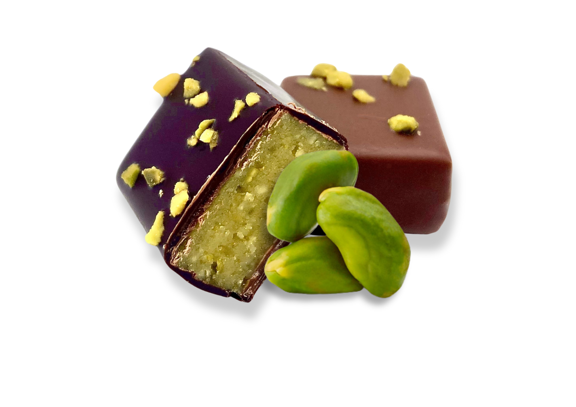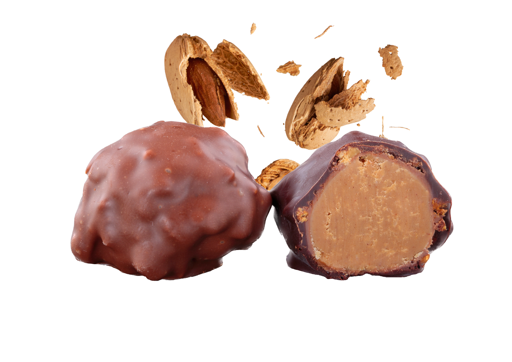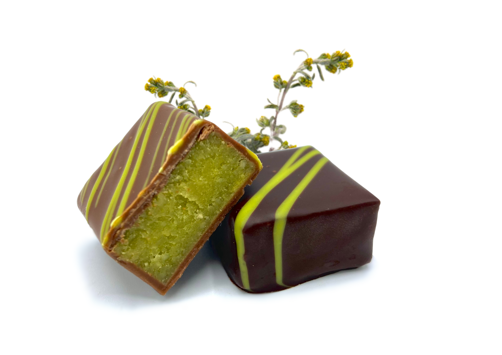 Spécialités PATES D’AMANDES : les Montdorines (socle noir), les Truffes Provençales (enrobage noir), les Pistaches (enrobage noir et lait), les Genépy (enrobage noir et lait), les Douceurs à la framboise (enrobage blanc) et les Calinoises (enrobage noir)