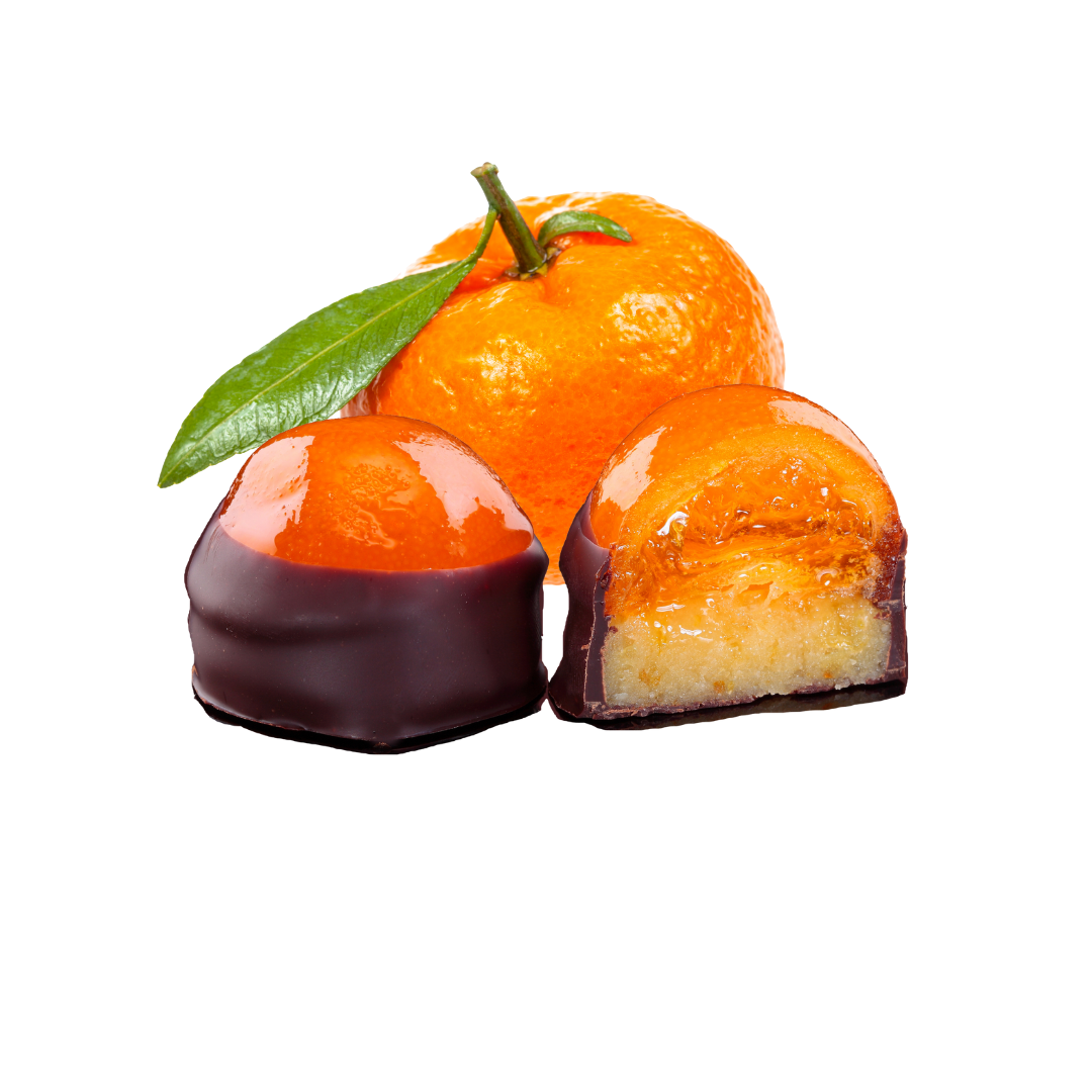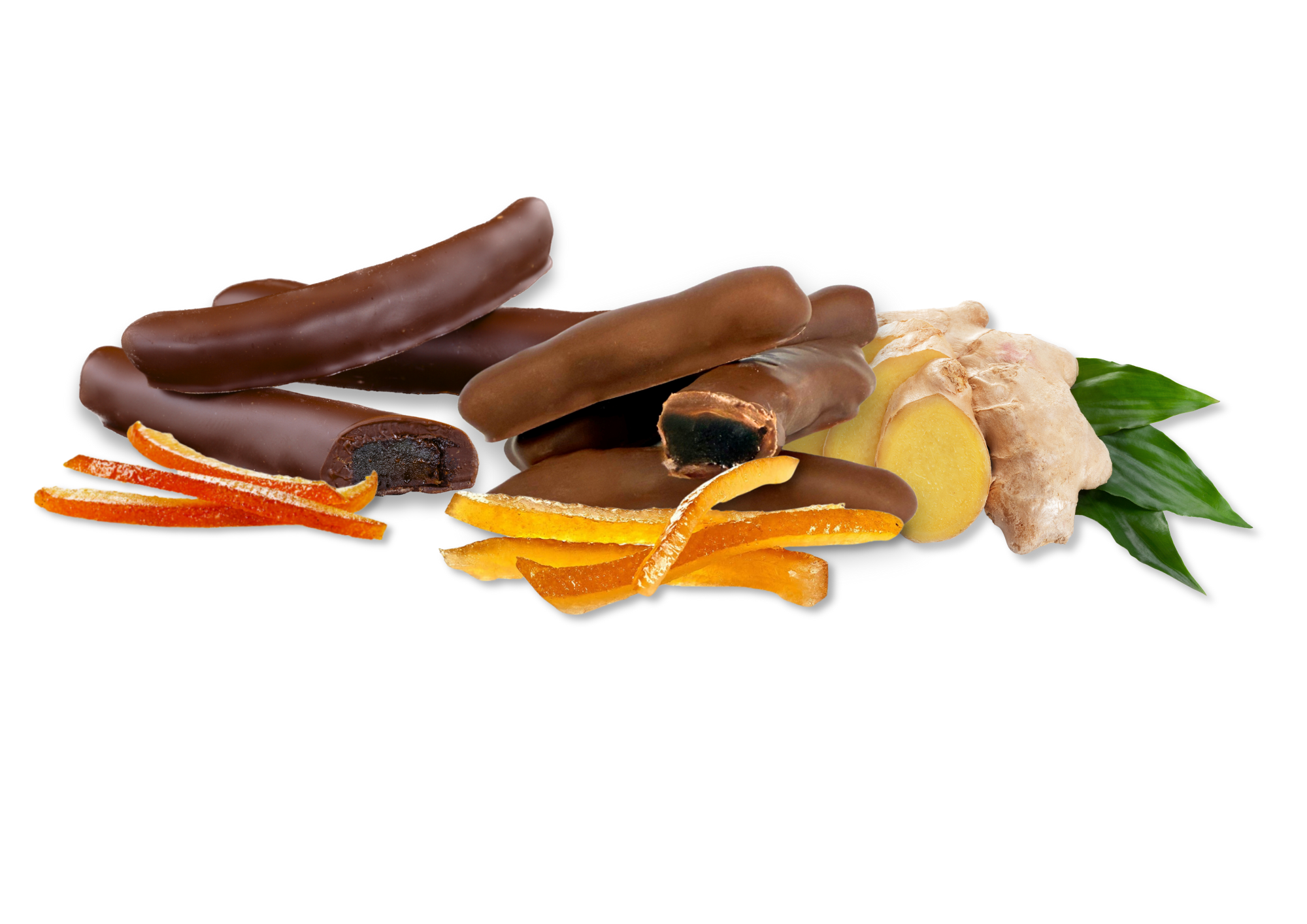 Spécialités ÉCORCES CONFITES : les Orangettes (enrobage noir), les Citronnettes (enrobage lait) et les Gingembrettes (enrobage noir)