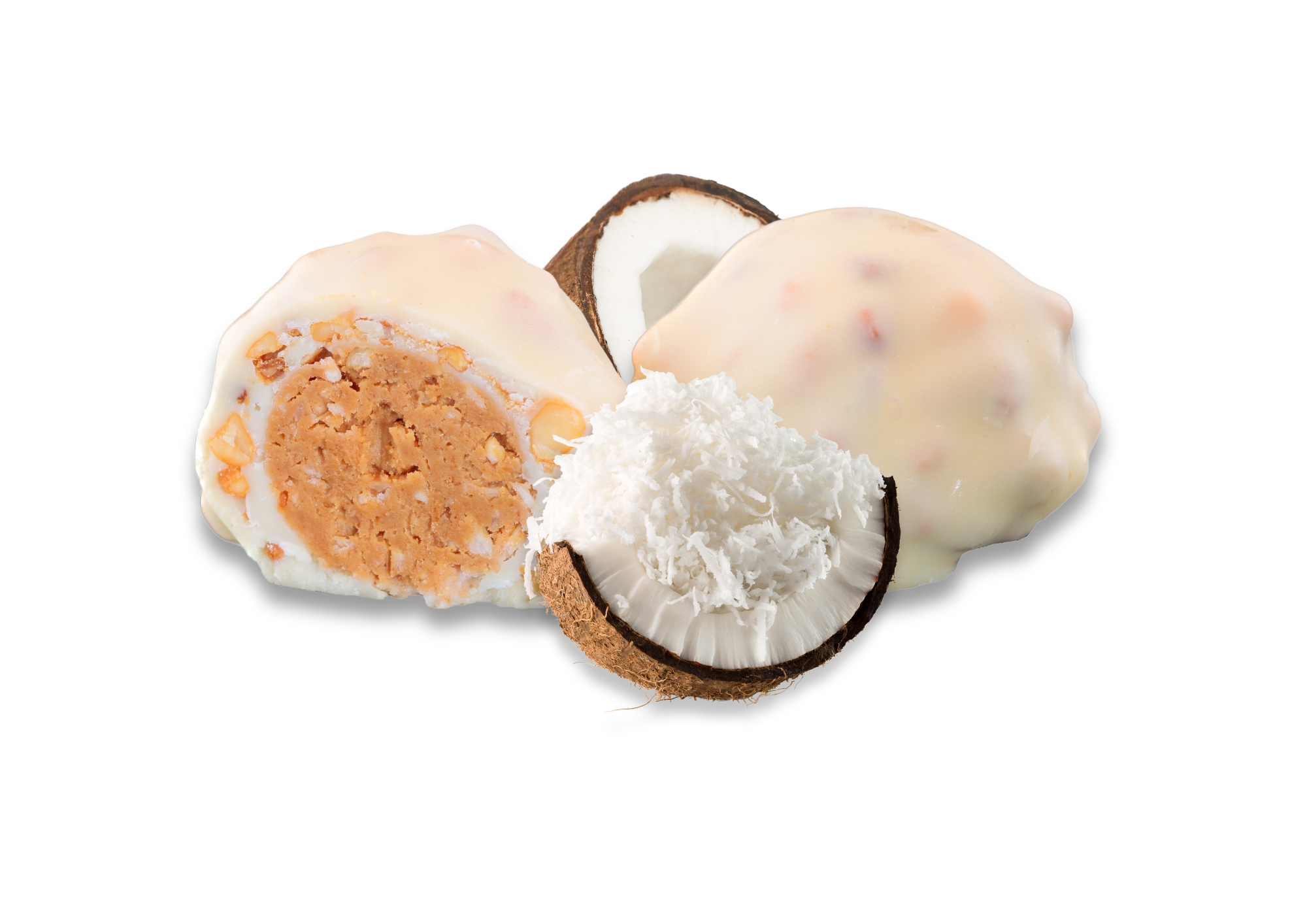 Spécialités PRALINÉS : Les Chardons bleus (enrobage blanc), les Rochers noix de coco (enrobage blanc), les Rochers pralinés (enrobage noir et lait)