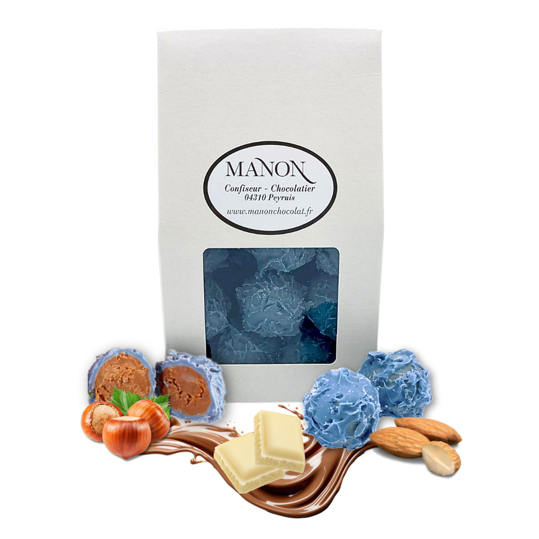 Aux noisettes et amandes finement broyées et mélangées au beurre de cacao, ce praliné fondant est enrobé de chocolat au lait et chocolat blanc.
