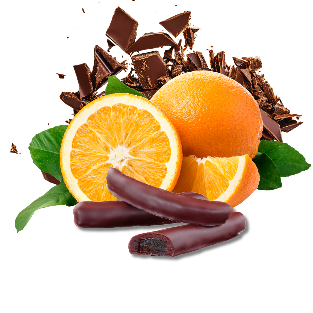 Les écorces d’orange sont moelleuses et enrobées de chocolat noir 72 % de cacao.