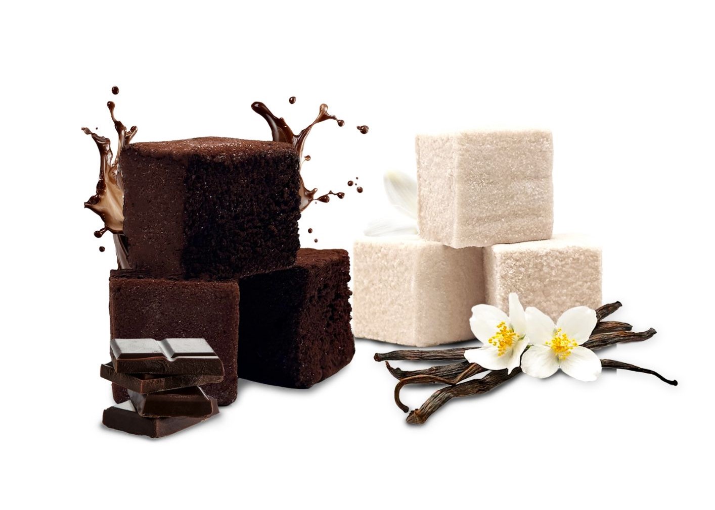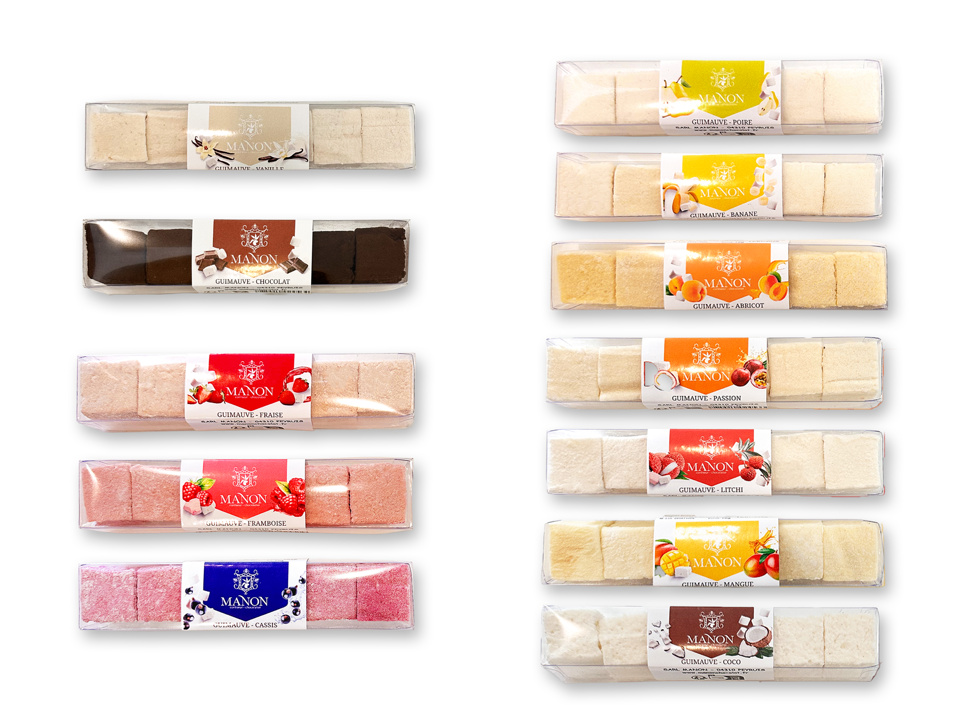Ingrédients : sucre, sirop de sucre inverti, eau, purée/pulpe de fruit (selon le parfum) ou (pâte de cacao) ou (gousse de vanille et arôme naturelle de vanille avec colorant caramel E150b), gélatine, amidon de maïs, sucre glace. valeurs nutritionnelles moyennes (pour 100g): 284kcal/1218kj – matières grasses 0.08g dont 0.01g d’acides gras saturés – glucides 68.1g dont 68g de sucre – protéines 2.6g – sel 14mg. valeurs nutritionnelles moyennes (pour 100g) différentes pour coco / chocolat/ vanille : de 350 kcal à 307 kcal